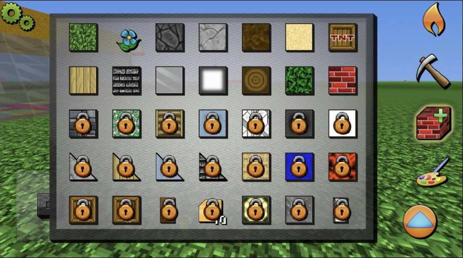 Eden - World Builder Lite restricted the use of many items in game. This was done in an attempt to get players to purchase the paid version of the game after playing on the Lite version. Each item that is restricted is hidden behind an orange lock icon.