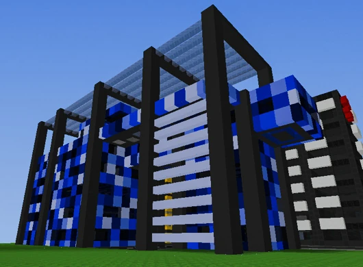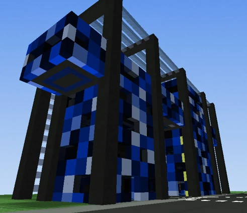 This building is an echo to the great blue tower in Eden Elites' world, judging by the blue pixels everywhere. People can chill and relax on the top flor, shaded by the great ceiling cut so as to filter light, enjoying many events, cocktails or artistic conferences.