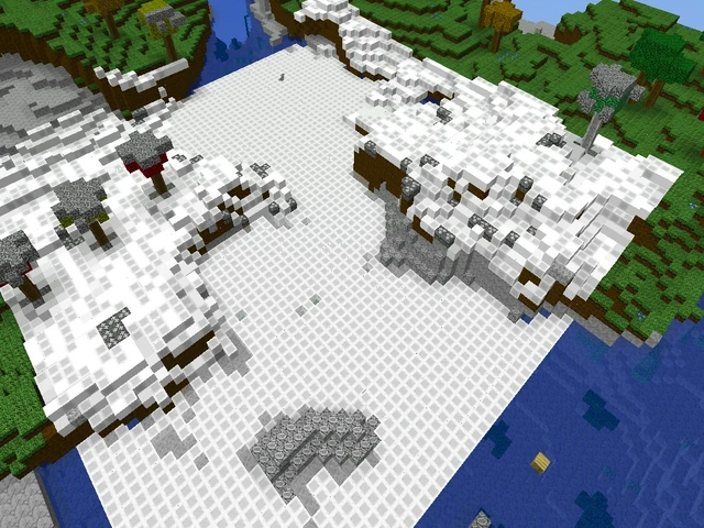 Here I have transformed a 64x64 patch of water, grass, trees and rock to look like it snowed. The algorithm for this transformation scans vertically starting at the top, looking for the topmost block to see what it is. Clouds and Leaves don't count, but leaves are made white if they're on the top. When it finds Grass, Weeds, or Stone it turns half of it into Ice and the other half into white Dirt or Sand or Cloud. The top of Water is made into ice except if the water is "shallow". Most everything else is made white, but only the topmost block. (In the picture you can see the Flower blocks were simply turned white, this was a bug.)
